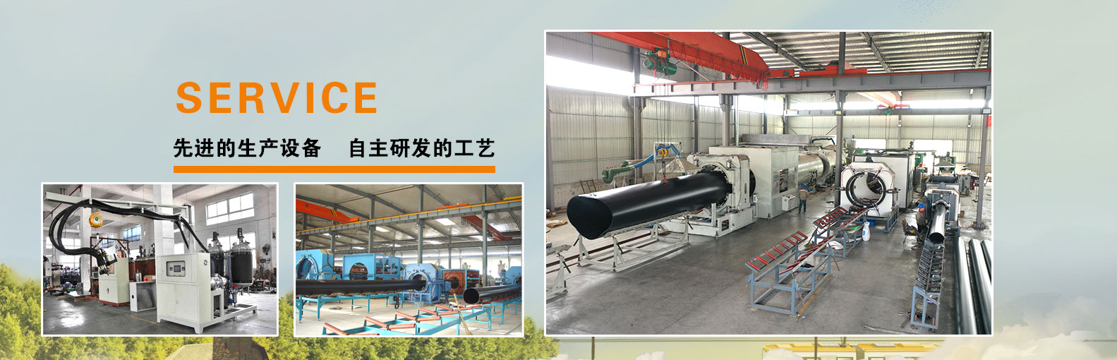 與之相配套的穿管設備和發泡平臺,年產DN50-DN1600 保溫管道15萬公里,保溫管件3萬件;拋丸機2臺、電暈設備4臺、電熱熔套袖生產設備3臺。做到了自動化,模具化,現代化生產